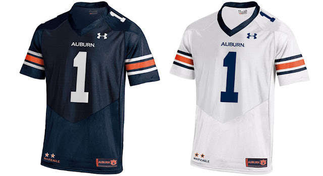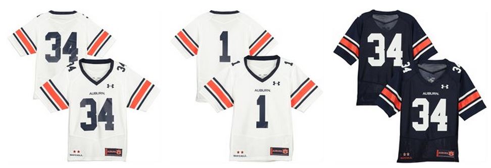 As the football team has updated to a new Under Armour template, the retail jerseys have as well. In the past few years, the retail stripes have been truncated, just like the team jerseys. For the first time since 2010, the retail jersey stripes go all the way around the sleeves, which looks worlds better. After the 2010 championships, two stars were added to the bottom hem of the jerseys, above the jock tag. Those two stars have now been moved to the opposite side of the tag. With the release of Under Armour’s most recent baseball and basketball jerseys, the materials have been rather thin, and felt pretty cheap. They’re much lighter than they should be, and used to be. I’ve held the new jerseys, and they seem to be much better quality than the baseball and basketball jerseys. But just be mindful of that when you shop for one. Especially since the price has increased once again, from $75.99 last year (and $65 the year before) to $80 this season. Many teams have decided to sell generic numbers, due to recent legal issues, and Auburn is one of those teams. The three numbers available are #1, like always, #15, for the 2015 season, and Bo Jackson’s #34. Some stores still have stock from last season, which include Pat Sullivan’s #7. Youth size jerseys are available and will sell for $59.99.