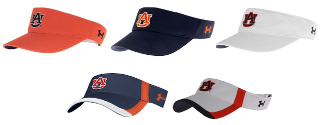 Last year, Under Armour provided three different styles of caps in Auburn colors. This year, there’s only two. The first of which is a plain colored hat – in orange, white, or blue – with a contrasting AU logo. The second is a tweaked version of last year’s sideline cap (the same design has been slightly tweaked over the last few years), this time with a two colored stripe around the bill and partly up the the side panels.