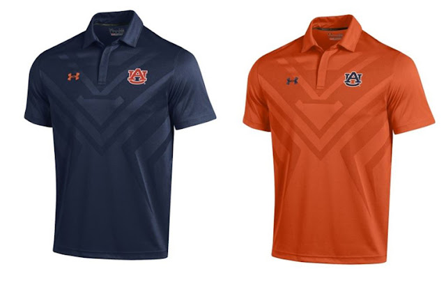 Under Armour has revealed a new base polo design that has a unique V-shaped pattern on the chest. Jordan Spieth made this design popular after his win at the Masters, but these were already revealed for Auburn before then. The back of the polos feature WAR EAGLE written down the middle. There is also a white version available.