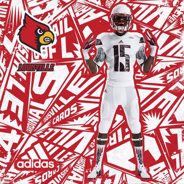 - Louisville – Adidas has produced a new “Uncaged” uniform for Louisville to be worn in the Chick-fil-a Kickoff Game against Auburn in Atlanta. The uniforms feature silver chrome-like numbers and shoulder stripes. The helmet has a chrome Old English “L” logo on the right side, and the left side features a very unique cardinal illustration – one that I will refer to as “Laser Chicken” from here on out. An oversized “L” logo is also placed on both hips on the pants. The Cardinals’ other uniforms have also been updated to the new ShockWeb 2.0 template, complete with tire treads, chrome number details,and oversized hip logos. The helmets also feature chrome decals and facemasks.