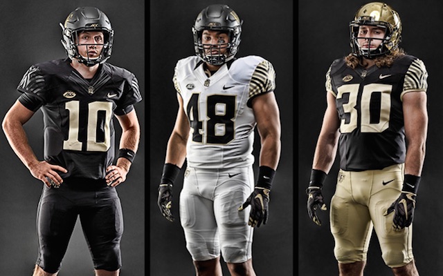 - Wake Forest – Wake Forest has worn the same uniform design since 2006 (granted it feels like much longer), and they finally got a much needed redesign to their football uniforms. The team rolled out three new uniform sets – three helmets, jerseys, and pants. The helmets come in gloss black, matte black, and chrome gold. The pants come in white, gold, and black. The unique part comes with the uniforms, where there is a white top as well as two different black designs. All three jerseys feature a stylized “W” design on the shoulder caps, which draws from the school’s academic logo and some architecture around campus. The white jersey features a gold shoulder cap and W design. One of the black jerseys also features a gold shoulder cap design, whereas the second black top has a black design, which makes it very difficult to make out the W design. The numbers on the jerseys have “angled notches at 18 and 34 degrees at the top and bottom, respectively” to honor the school’s founding in 1834.
