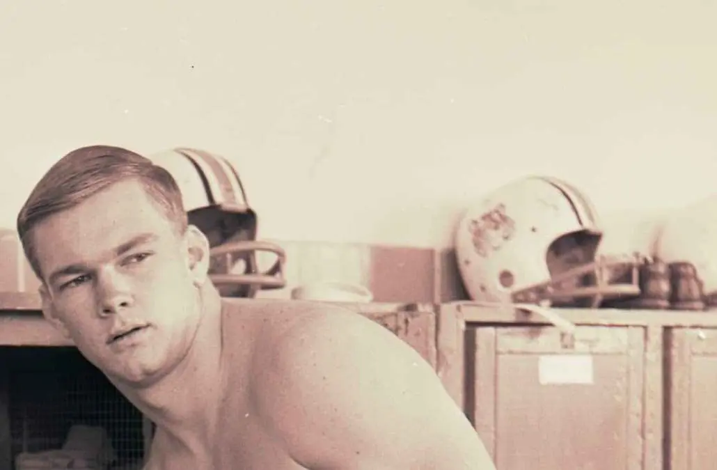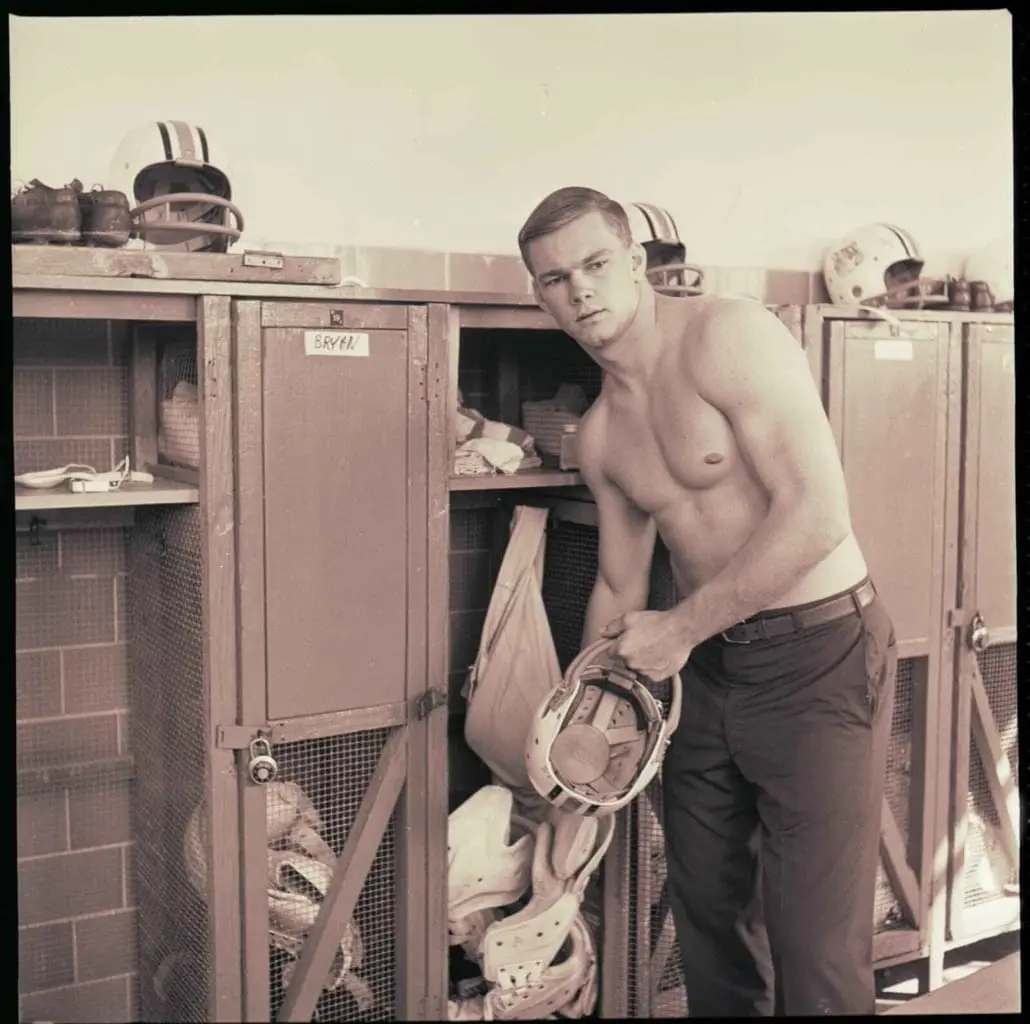 The man in the photo is none other than All-American running back Tucker Frederickson. The subject of much attention during his playing days, being called “the most complete football player I’ve ever seen,” by his head coach Shug Jordan. Though Frederickson isn’t the point to focus on in this photo. Instead, take a look in the background. On top of the lockers sit the football helmets worn during the 1964 season, when the player numbers donned the sides. But wait, there’s no numbers visible. But there is something else. Let’s take a closer look: