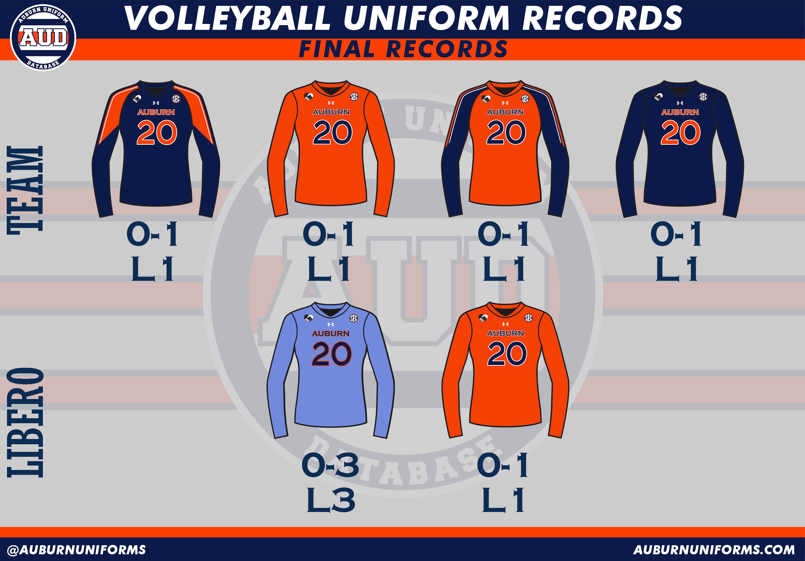 Volleyball is the newest addition to the Auburn Uniform Database. I hope to add more historic designs to this site soon. The last four years of uniforms can be viewed here.