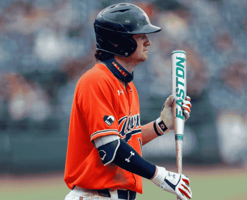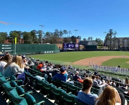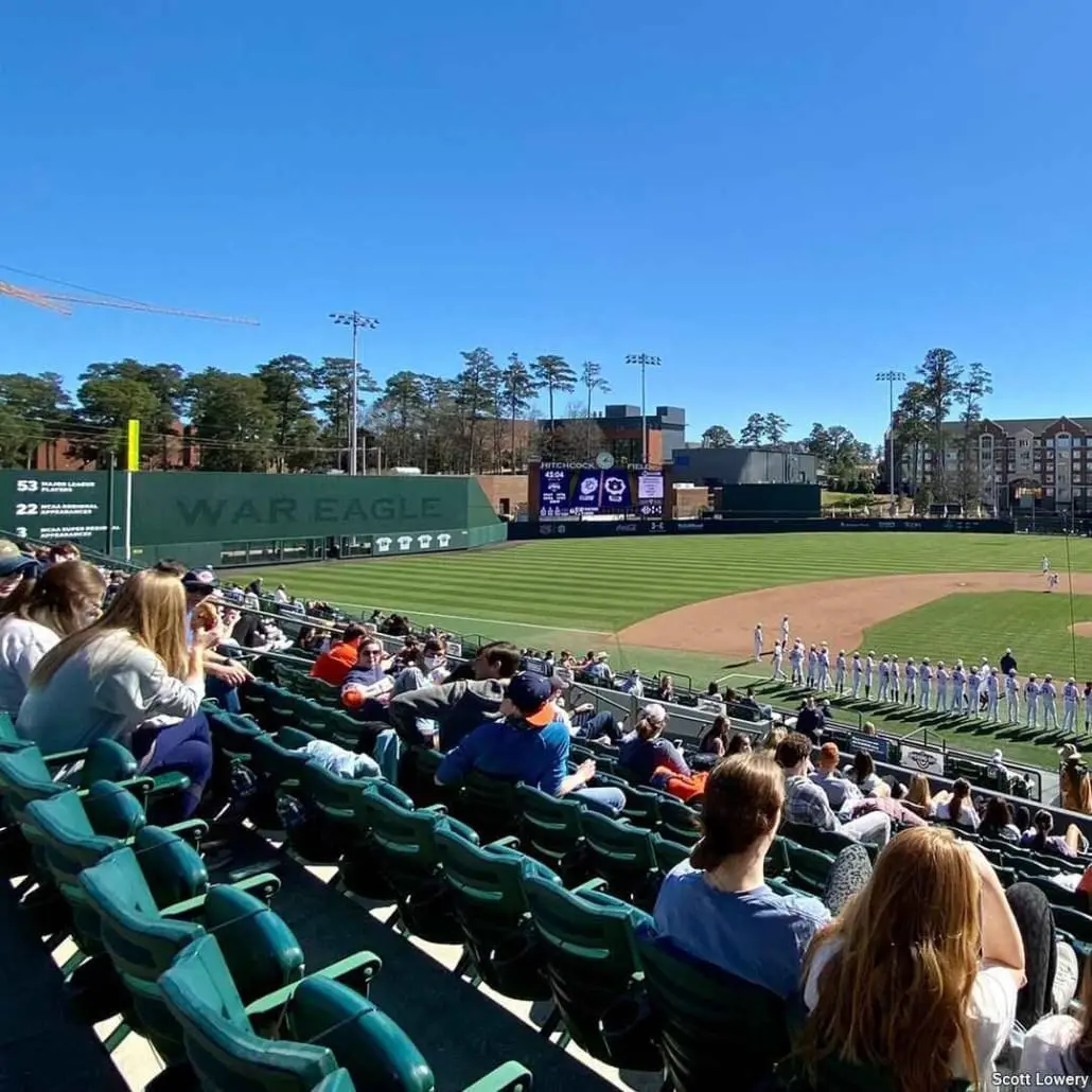 Outside of uniforms, Auburn did make a few changes to Plainsman Park’s appearance this year. The stadium’s concrete walls were painted grey, the back padding behind home plate is navy rather than green, some chairs behind home were swapped for new mesh-backed seats, and the Green Monster and batter’s eye have been adorned with tone-on-tone graphics.
