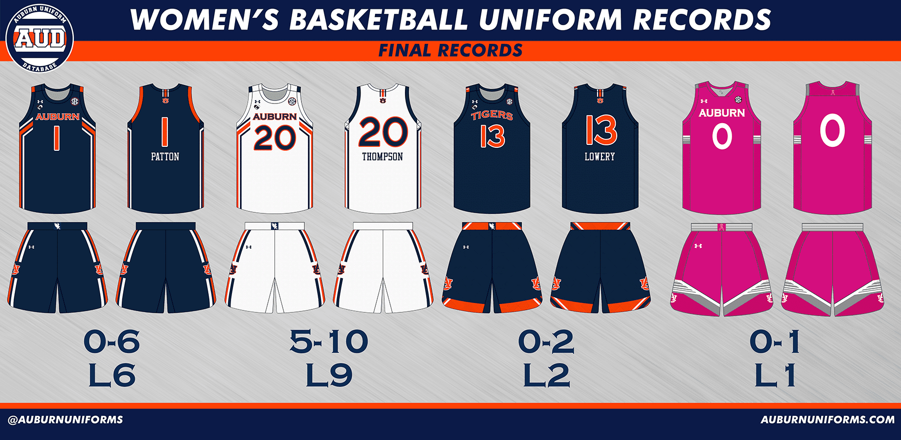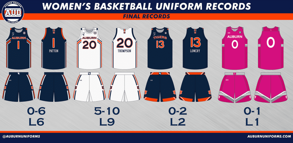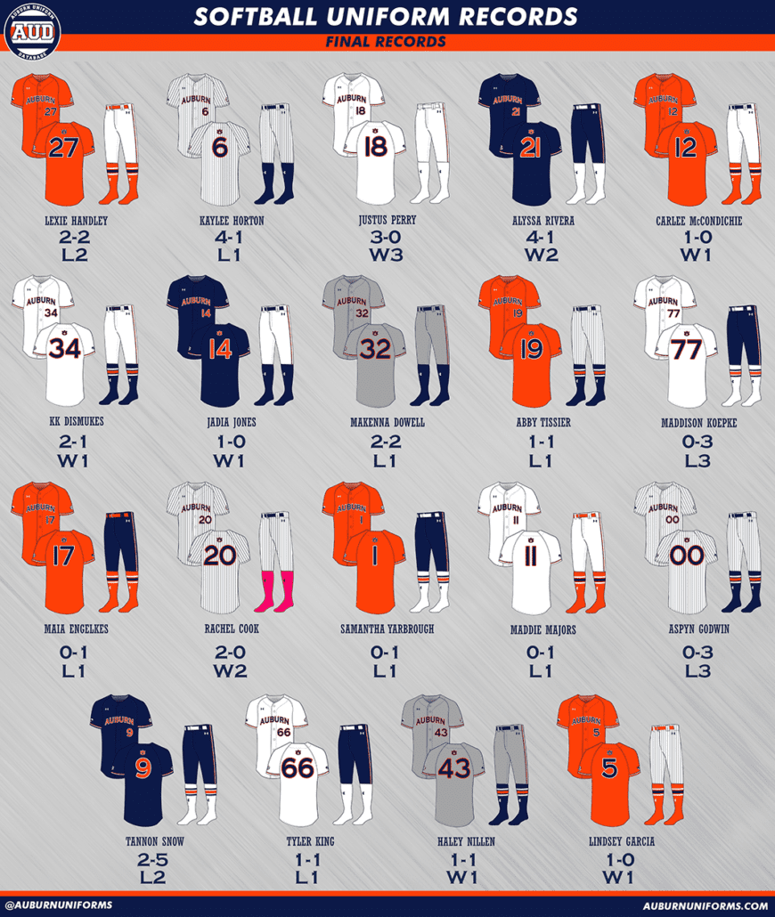 The Auburn Softball uniform history has recently seen a makeover, moving to a new template like the designs above, and having many more designs added. You can view nearly every uniform design worn since the team’s inception in 1997 here.