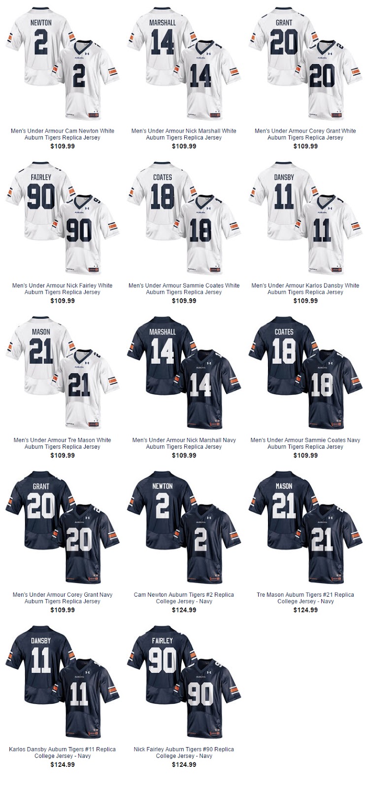 As has been the case the last few years, there are only a few select numbers available for purchase on jerseys. Even if you want to customize one, you are now stuck using the predetermined jersey numbers. This year’s numbers include 1, 2 for Cam Newton, 17 for the year, and 34 for Bo Jackson. Pat Sullivan’s number 7 was available last year. Each is available in either white or navy.