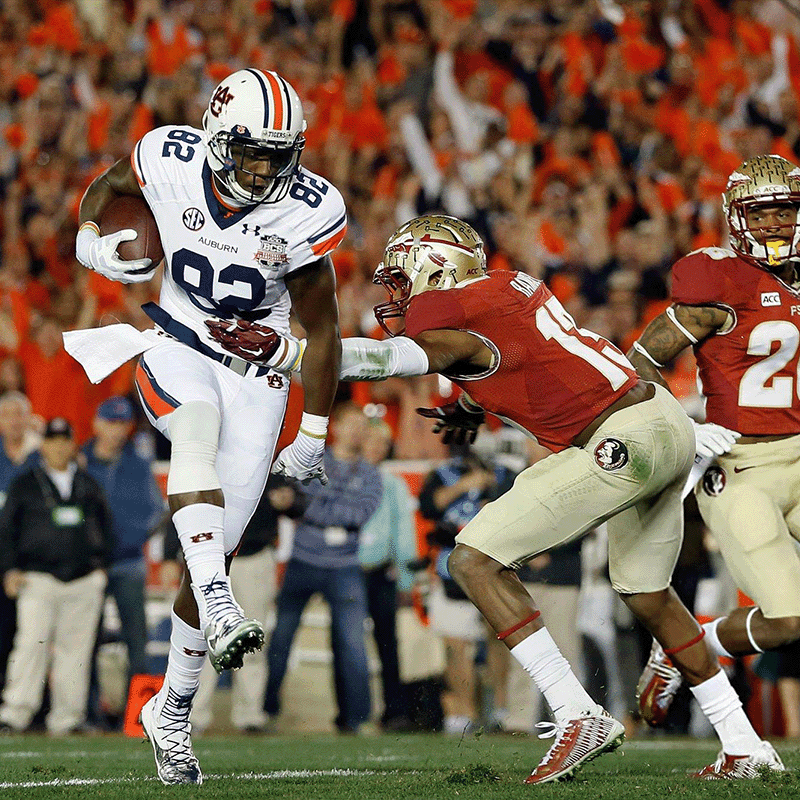 When it came time for the BCS National Championship Game – Auburn’s second appearance in four seasons – the Tigers wore white for the matchup against Florida State. Auburn once again wore the large BCS decal on the back of the helmet in lieu of the NCAA pennant decal. They also placed the Rose Bowl Championship Game patch in an odd place on the jersey.