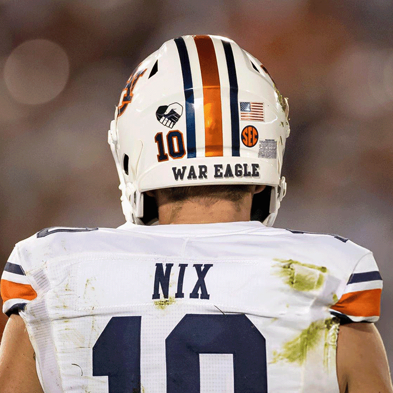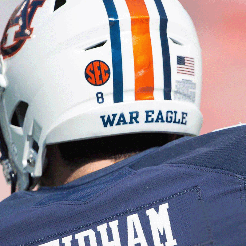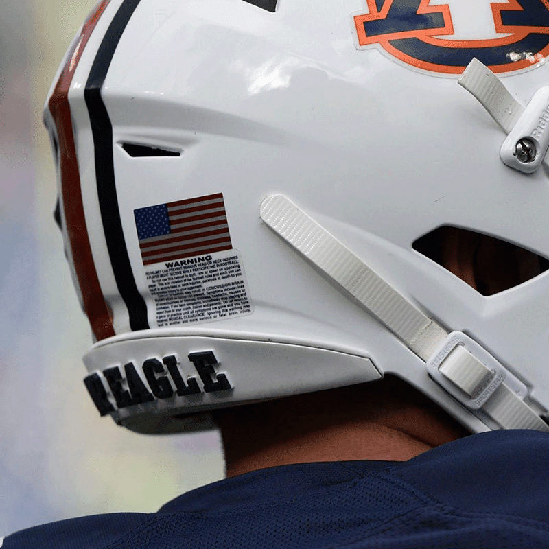 The Auburn Unity jersey patch was removed but returned as a helmet decal. The handshake icon was placed above the new large numbers. This forced the SEC decal to move to the right side of the stripe. The American flag decal would sit above the conference logo. Auburn would also replace the new chrome USA flag with an EmbossTech textured decal with more depth than the flat decal.