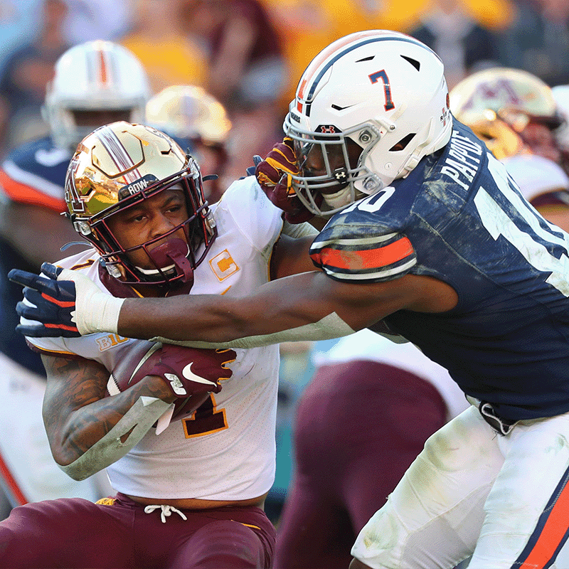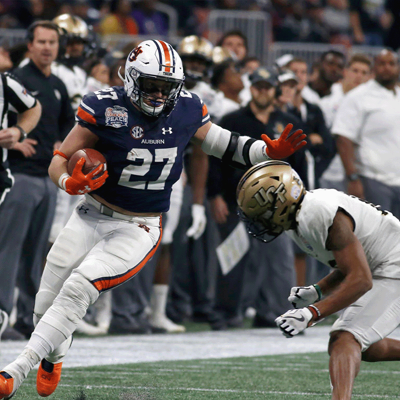 The Tigers would finish the season with two consecutive games in the new Mercedes-Benz Stadium in Atlanta with another Chick-fil-A Peach Bowl appearance. Auburn would again place the bowl patch on the right chest with a large decal on the helmet.