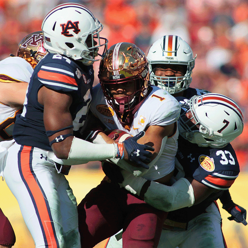 A 9-3 season saw the Tigers land in the Tampa, Florida-based Outback Bowl to face the Minnesota Golden Gophers for the first time. Auburn would buck tradition of the last four seasons and place the bowl patch on the left chest. With the Under Armour logo, the SEC conference patch, and the 150 patch, the addition of the bowl patch created an overcrowded jersey.