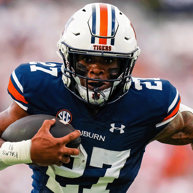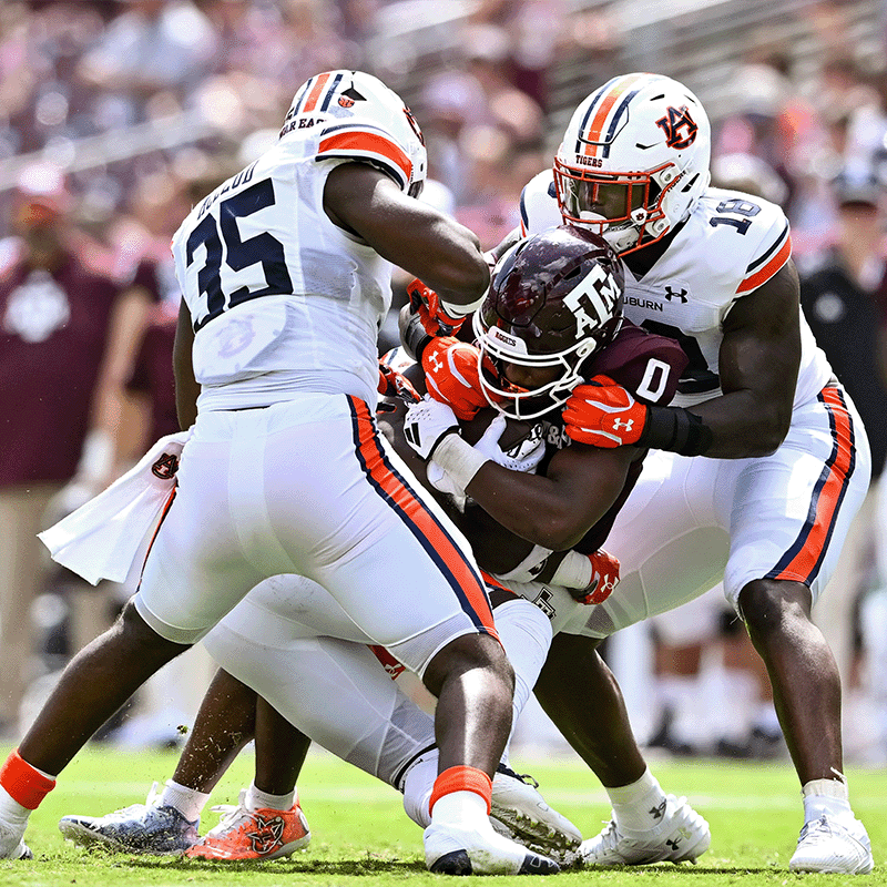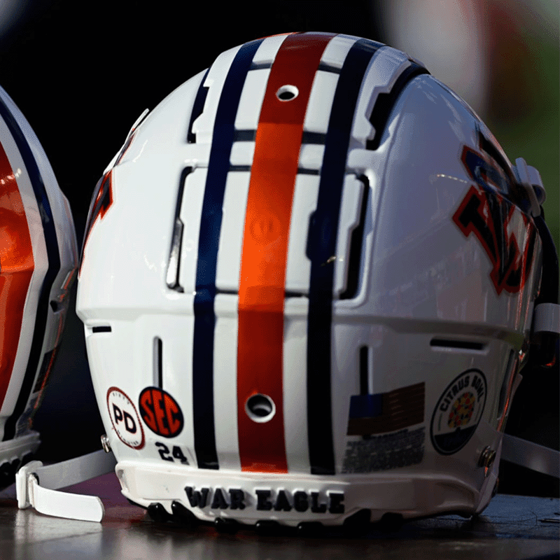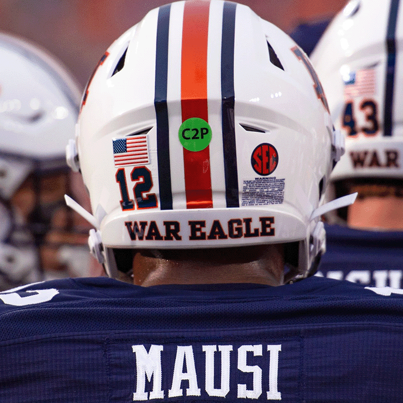 A new decal was also added to some helmets this season. Thanks to the NCAA allowing coach-to-player communications this season, a green “C2P” circle indicated players wearing radio-equipped helmets. Auburn placed the decals on the middle orange stripe.