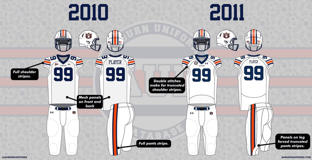 The white jerseys featured the sleeve stripes that are still worn today. Wearing the white tops allowed Auburn to be period-accurate without having to order brand new uniforms – the only expense was outfitting the team in grey facemasks.