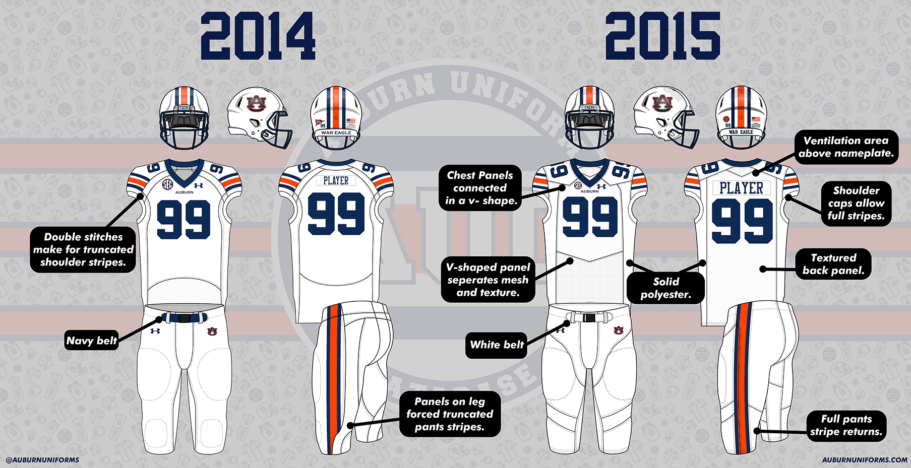 Unlike the season following the 2010 national championship, Auburn did not receive new uniforms for the 2014 season. Things remained the same – same template, same conference patch, same NCAA decal on the helmet, even the same poor bowl patch placement.